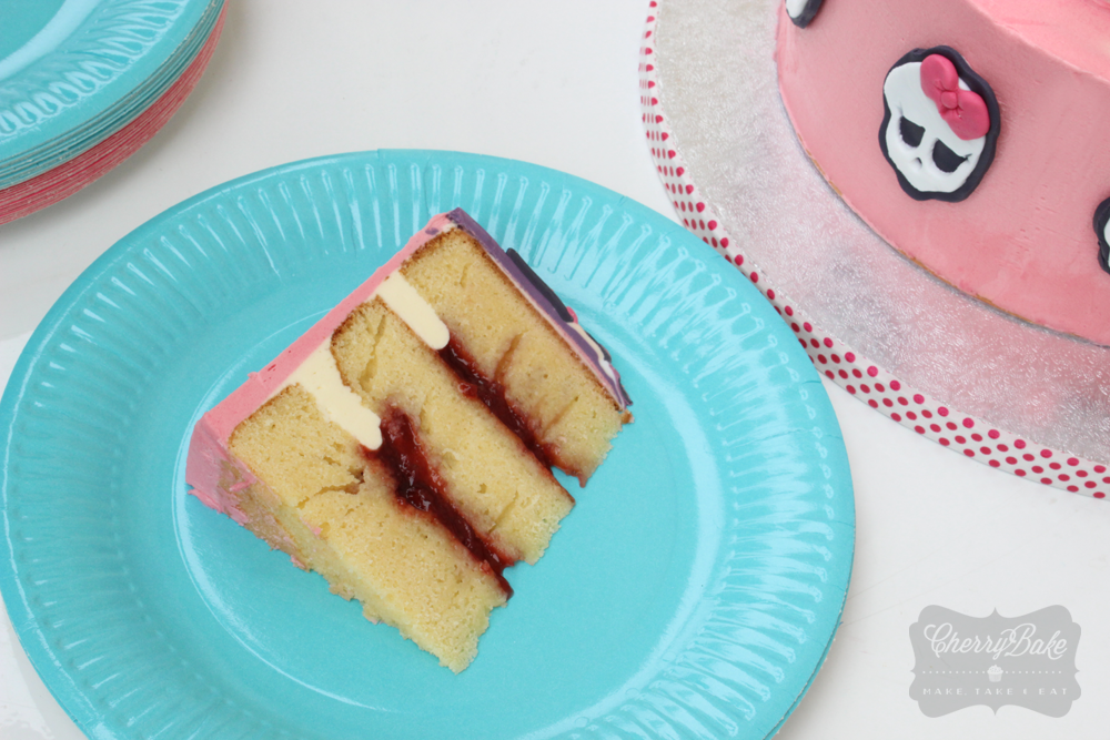 Como se trata de una vampiresa, había que poner "sangre" por alguna parte. Así que decidí rellenarla de buttercream de vainilla y... mermelada de fresa :)